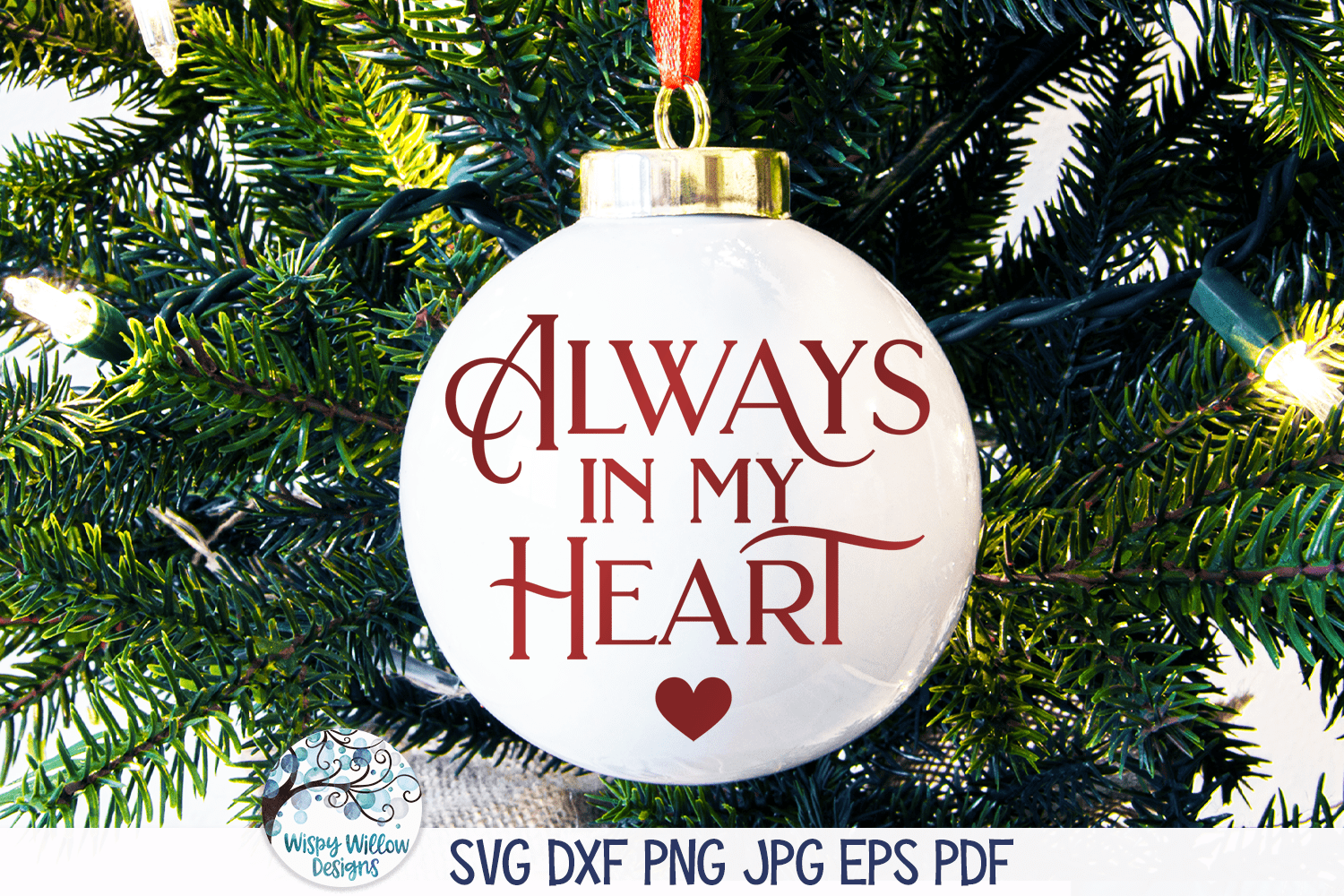 Embrace cherished memories with our Always In My Heart SVG ornament design. This digital download includes versatile formats—SVG, DXF, PNG, JPG, EPS, and PDF—perfect for crafting heartfelt gifts. Create stunning decals, ornaments and more while enjoying a small business license for your handmade creations.