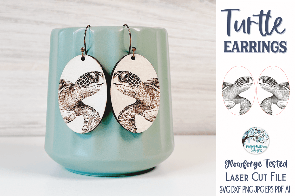 Make a statement with these unique sea turtle earrings, designed for Glowforge or Laser Cutter. These earrings are sure to be a conversation starter and show your love of nature. Perfect for wearing to the beach or any occasion.