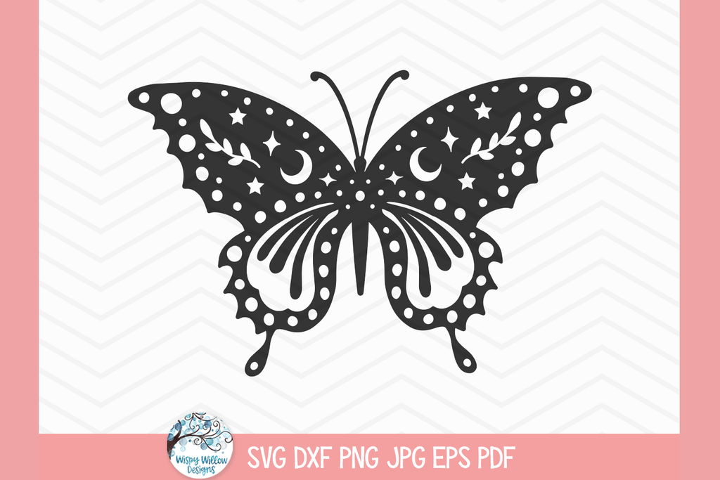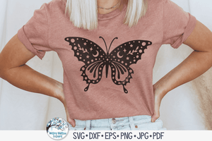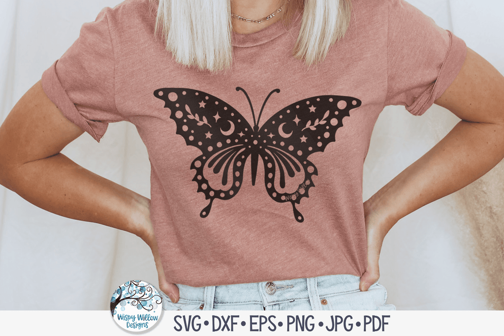 This mystical butterfly design features elegant celestial details, perfect for t-shirts, tote bags, decals, wall art, and more.