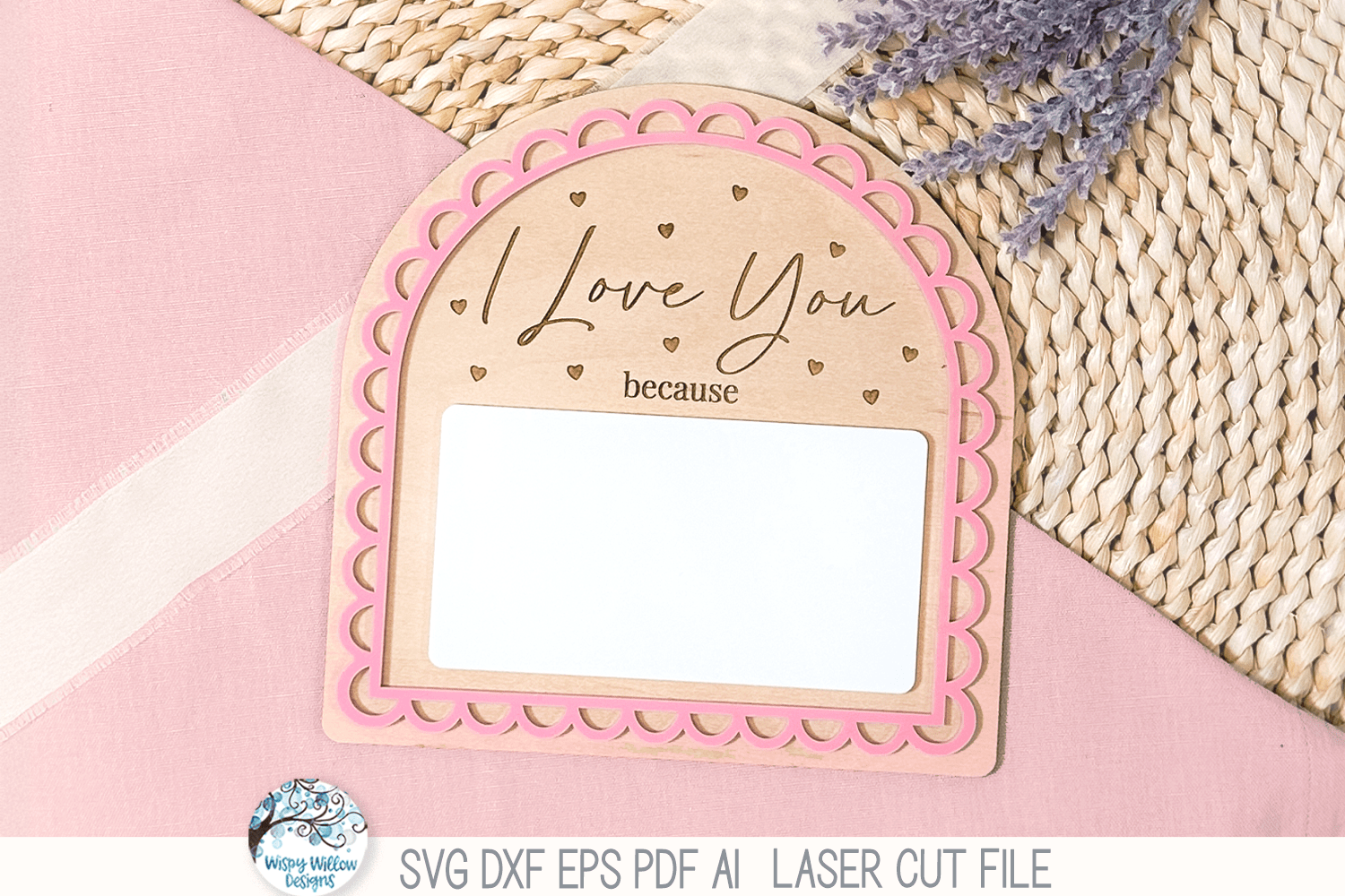 Create a meaningful and reusable gift with this "I Love You Because" Scalloped Arch Dry Erase Sign SVG file! Perfect for expressing your love on Valentine’s Day, anniversaries, or any special occasion, this design features elegant text, scalloped details, and a writable space for personal messages. Compatible with Glowforge, xTool, and other laser cutting machines, this versatile digital download includes SVG, DXF, PNG, JPG, EPS, PDF, and AI formats. Ideal for heartfelt gifts, keepsakes, or home decor.