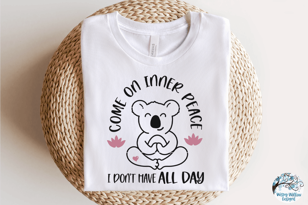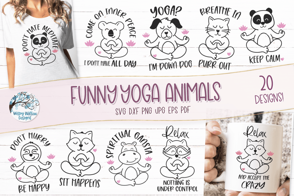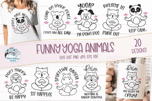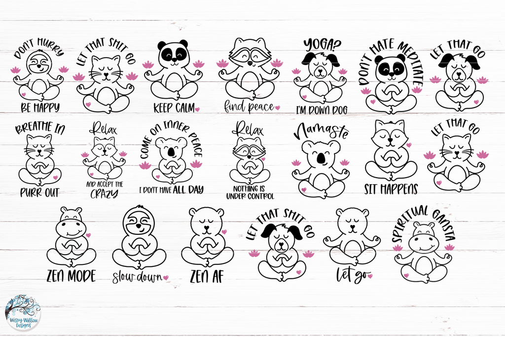 These cute Funny Yoga Animal SVGs will inspire you to laugh while finding your inner peace. These files are optimized to cut and weed easily. Includes Yoga Sloth, Fox, Dog, Raccoon, Bear, Cat, Koala, Panda, Hippo animals with cute phrases such as Come On Inner Peace I Don't Have All Day, Yoga? I'm Down Dog, Don't Hurry Be Happy, Let That Shit Go, Relax Nothing Is Under Control and more.