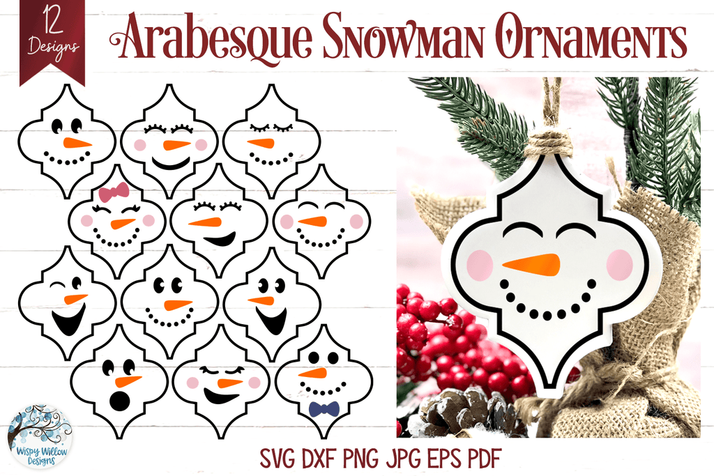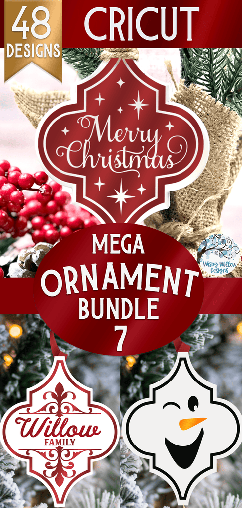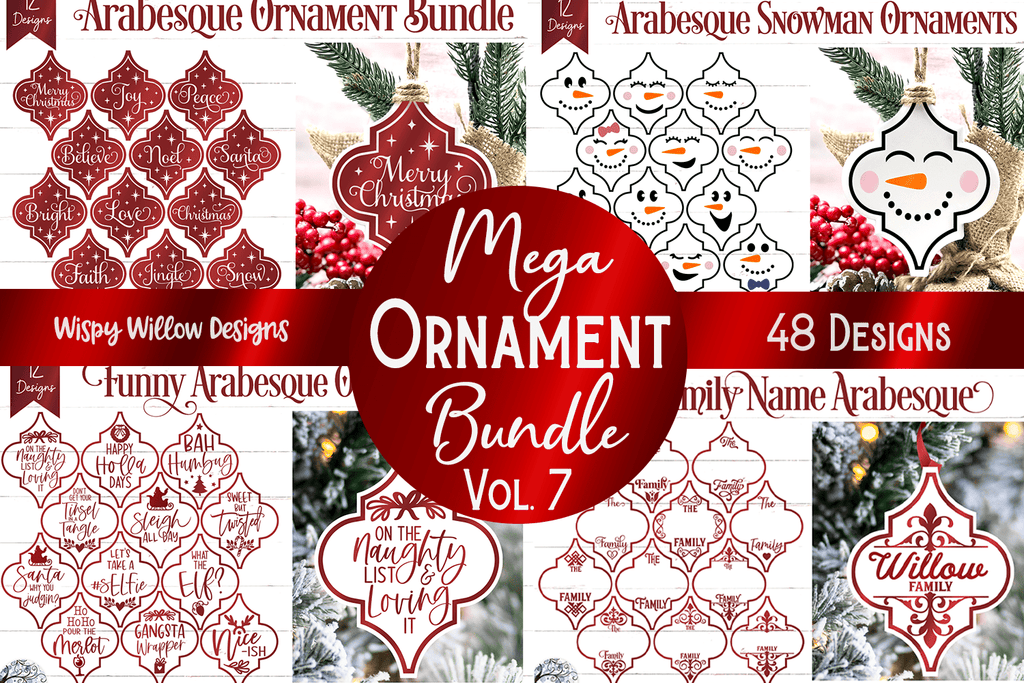 The Mega Ornament Bundle 7 includes Funny Christmas ornaments, adorable Snowman Face ornaments, Merry Christmas phrase ornaments with beautiful stars, and a personalized Family name bundle.