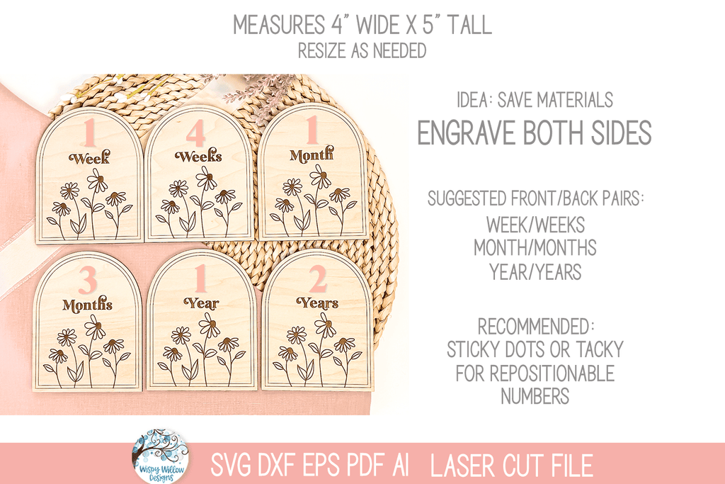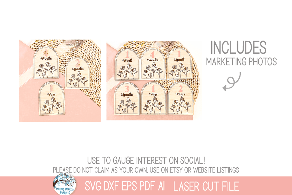 This Newborn Baby Girl Flower Arch Milestone Bundle SVG is perfect for laser cutting! It includes delicate floral arch milestone markers to celebrate your baby's first year and beyond. Ideal for personalized gifts or photo props.